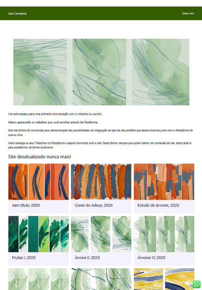 Nosso Site Portfólio não é um site comum. Ele é um reflexo vivo do seu acervo. A mágica é simples: todo o trabalho que você faz para catalogar suas obras no Acervo Vivo Studio alimenta seu site automaticamente. Você adiciona uma obra no Studio, e com um clique, ela aparece no seu site. É a sua vitrine online que trabalha para você.