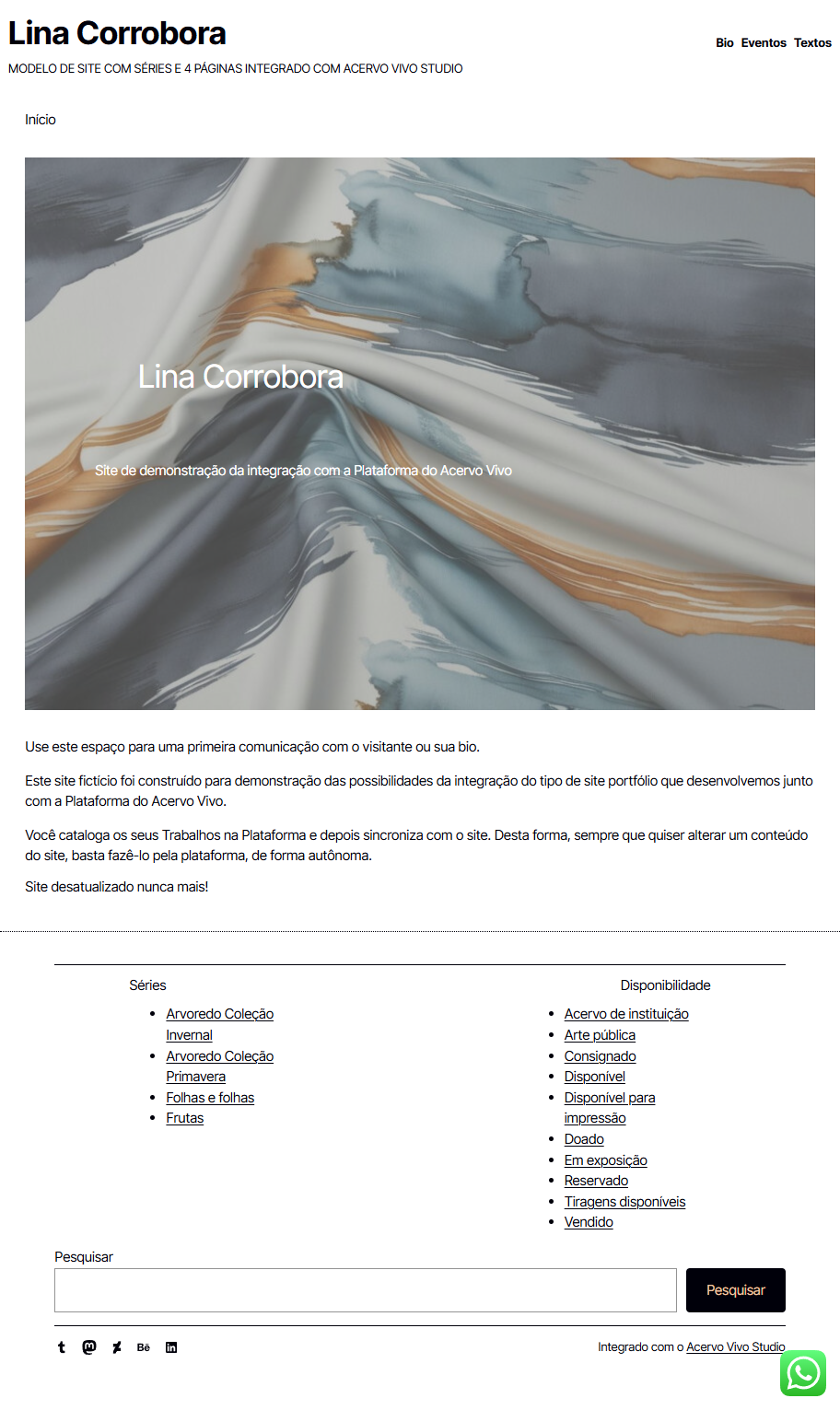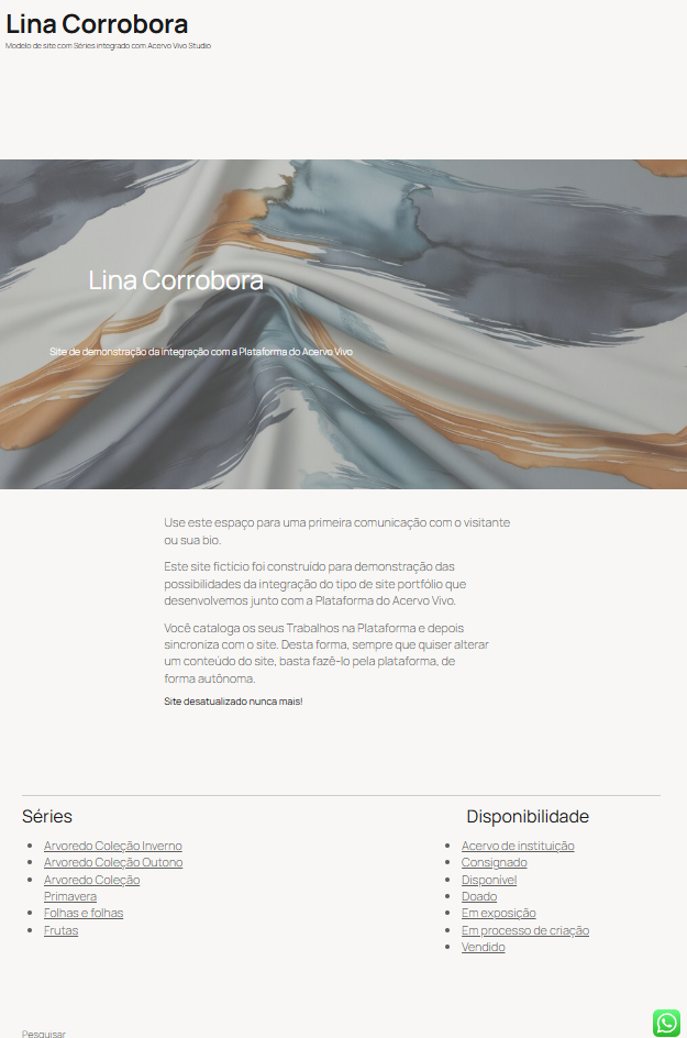 Site com uma página contendo: Imagem principal, bio ou statement, links para as Séries e Disponibilidades dos Trabalhos.