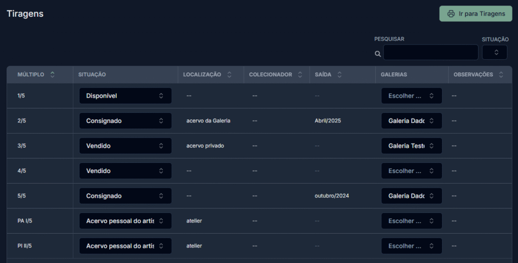 - Esta seção lista todos os exemplares individuais da tiragem da sua obra (ex: 1/10, 2/10, …, PA 1/2, se você adicionar provas).