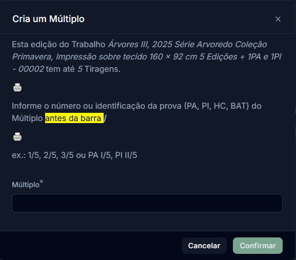 Se além da edição principal, você possui Provas de Artista (PA), Provas de Editor (PE), etc., você poderá adicionar essas provas como novos itens na lista na página Tiragens clicando no botão “+ Novo Múltiplo”, especificando sua numeração (ex: PA I/III). Informe o número ou identificação da prova (PA, PI, HC, BAT) da Reprodução antes da barra . O número que virá após a barra é o ‘Número máximo de Tiragens que você especificou na Ficha técnica do Trabalho.