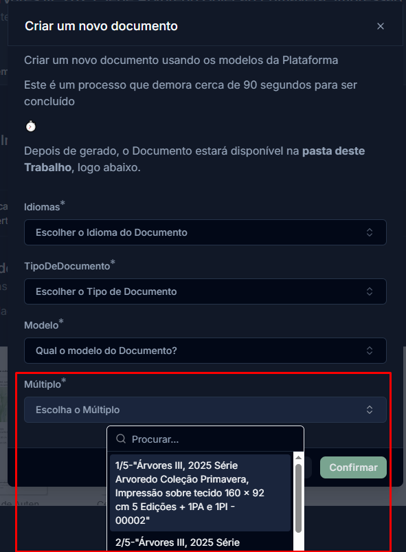 Quando você gera uma Ficha para Seguradora ou um documento de proveniência para uma obra que possui tiragem (através da Aba “Documentos e Anexos”), a plataforma solicita o número do Múltiplo. O documento especificará o número do exemplar dentro da tiragem total (ex: “Tiragem 3/10”), reforçando a autenticidade e o valor do exemplar específico.