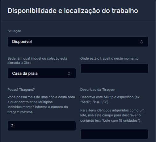 - O campo Possui tiragem? só aparece para as Linguagens que permitem a reprodução. Por exemplo: para aquarela ele não aparecerá, se você vai criar uma reprodução de uma aquarela, catalogue outro Trabalho com a Liguagem como ‘Fine Art’‘ pois ela permite as reproduções.
